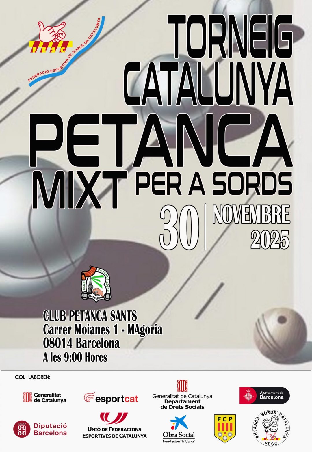 El Torneig Catalunya de Petanca Mixt per a Sords 2025 se celebrarà el proper 30 de novembre de 2025 al Club Petanca Sants, situat al Carrer Moianès, 1 – Magòria, 08014 Barcelona. L’inici de la competició serà a les 9:00 h.